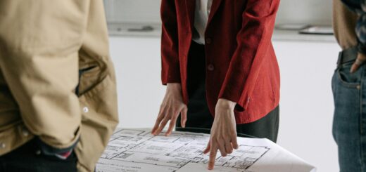 Three people reviewing a blueprint, symbolizing planning and strategy in real estate.